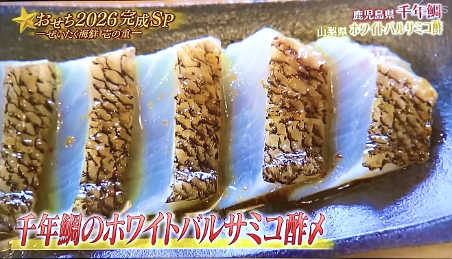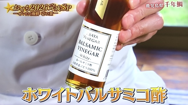 10月11日(土)O.A.のおせち完成回では、【千年鯛のホワイトバルサミコ酢〆】が放映されました。甘みの濃い鯛を一晩ホワイトバルサミコ酢で漬け〆、なんとソースにもホワイトバルサミコ酢が使われた贅沢な逸品です。
