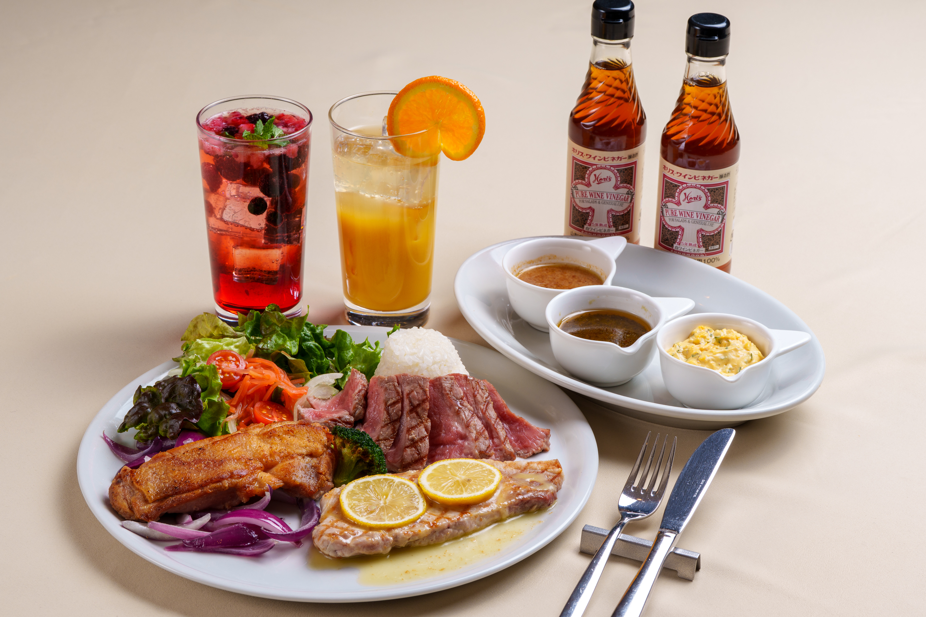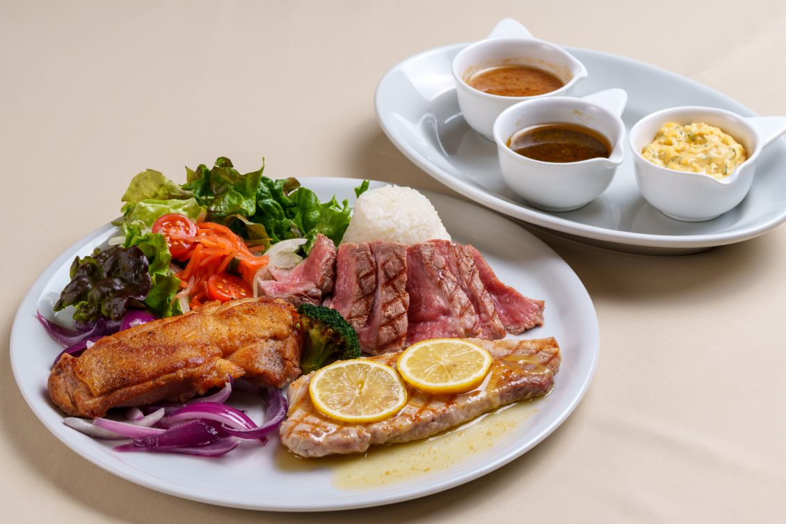 鶏・豚・牛の3種類のボリュームやっぷりの贅沢なお肉を、ホリスワインビネガーの風味を活かした3種類の特製ソースで食べ比べ!どのソースもそれぞれのお肉に合うように絶妙な配分で作っています。サラダにかけても◎